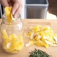 For a chemical-free cleaning spray, soak lemon or orange peels in white vinegar for about a week. Strain the liquid, pour it into a spray bottle, and use it to clean countertops, mirrors, or glass. It disinfects surfaces while leaving behind a crisp, natural fragrance that lingers.