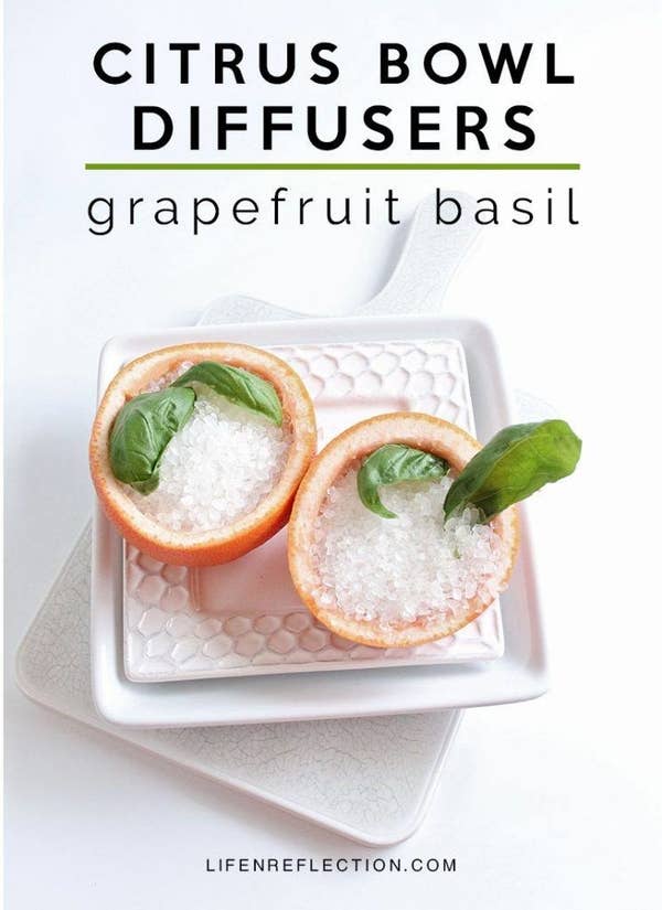 Hollow out half a grapefruit and fill it with coarse sea salt and a few basil leaves. The salt absorbs moisture while the citrus and herbs give off a bright, fresh scent. It’s simple, inexpensive, and doubles as a cheerful table decoration.